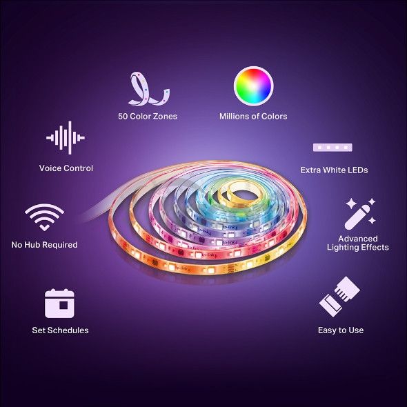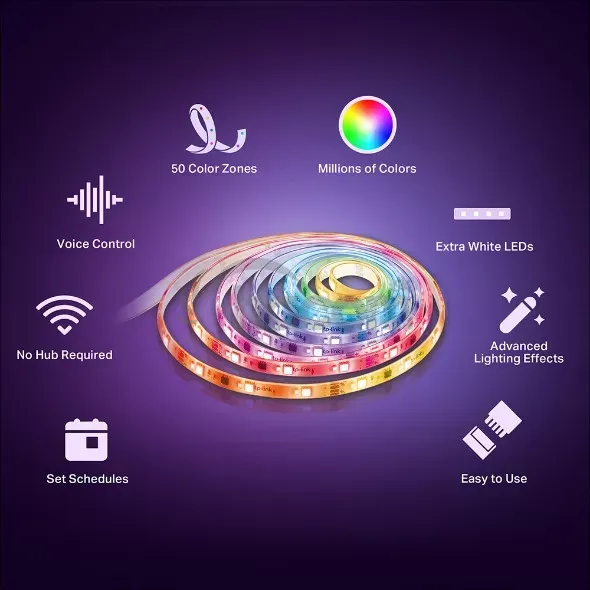 FEATURE: Tapo Smart app, no húb required, práce s Alexa, Google Assistant, remote control, preddefinované lighting effects, 16 miliónov farieb, customize farebné zóny, lifetime up to 25,000 hrs, 1%-100% dimmable, cuttable, presets easy installation and setup, schedule, group lighting control, energy usage monitoring, set scenes, customize your lighting