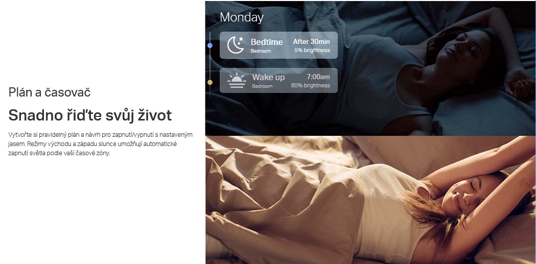 • Časový plán: vytvorte si pravidelný plán pre zapnutie / vypnutie s nastaveným jasom