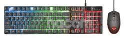 Trust GXT 838 Azor Keyboard and Mouse Set. Osvetlená herná myš a klávesnica v plnej veľkosti s anti-ghosting a multimediálnymi klávesmi. Nastavte klávesnicu do správnej výšky pomocou protišmykových gumových nožičiek a ste pripravení hrať plne farebne: klávesnica je dodávaná s kombinovanými farebnými režimami LED s nastaviteľným jasom.klávesnica
