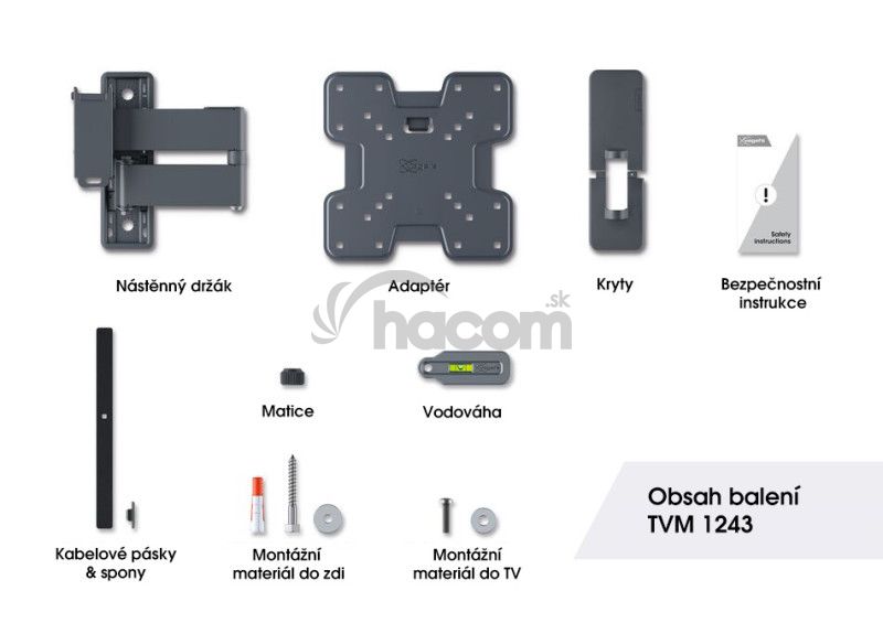 Maximálne pohodlie pri sledovaní z akéhokoľvek uhla v miestnosti. To ponúka tento nástenný držiak televízora QUICK Full-Motion+. Držiak je možné otočiť až o 180 °, môžete ho tiež nakloniť až o 15 °. Inštalácia je mimoriadne jednoduchá. Televízor bezpečne pripevníte na stenu za menej ako 30 minút. TVM 1243 je vhodný pre televízory s uhlopriečkou od 19 do 43 palcov a hmotnosťou do 15 kg.