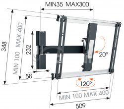 Nástenný držiak pre TV (26 "-55"), rameno, náklon 20 °, otáčanie 120 °, nosnosť 18kg, VESA 100x100 až 400x400mm, vzdialenosť od steny 35-300, striebornýParametre