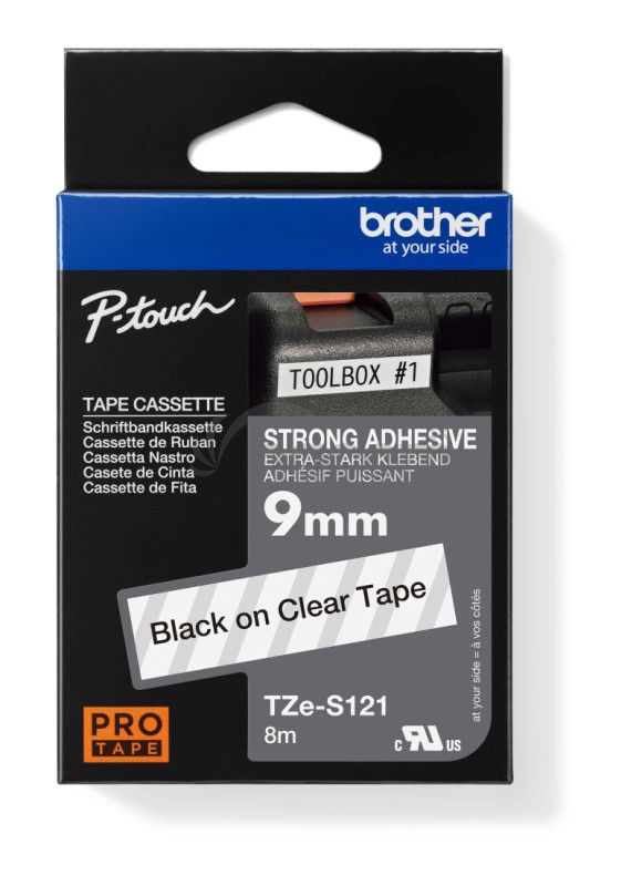 Originálna kazeta s laminovanou páskou TZe-S121 kompatibilná so širokým radom tlačiarní Brother P-touch je obzvlášť všestranná vďaka svojej ľahko čitateľnej čiernej a priesvitnej farbe - ideálna pre domácnosť domácnosti, kanceláriu a ďalšie pracoviská.* Šírka 9 mm, dĺžka 8 m