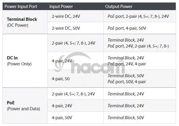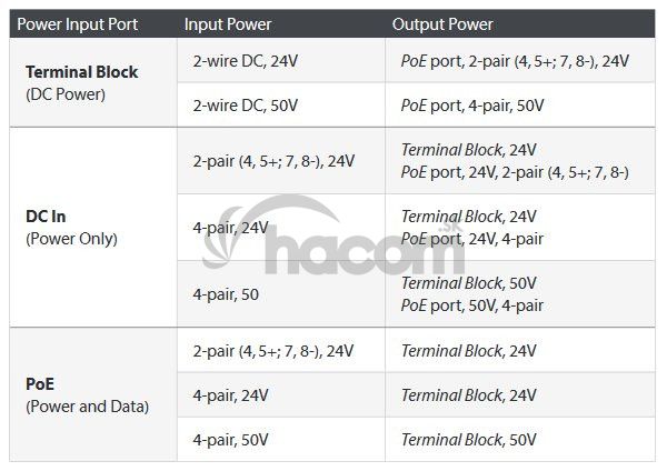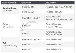Pre napájanie prevodníka sú celkom 3 možnosti: prvá je DC svorkovnica, druhá a tretia je cez RJ45 porty. Prevodník je možné teda napájať z oboch ethernetových portov, avšak dáta prenáša iba port označený ako POE.