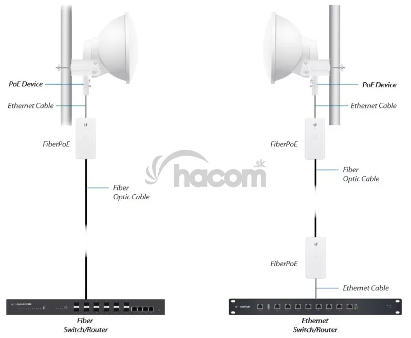 Ubiquiti FiberPOE je cenovo dostupný, gigabitový, opticko-metalický, vonkajší konvertor, ktorý okrem prevodu dát z optického vlákna na metalický kábel vie aj napájanie pomocou PoE.