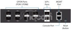 Čo sa týka konektorov, UF-OLD má okrem 8 GPON portov aj dva SFP+ porty s rýchlosťou 10G, jeden ethernetový port určený iba pre manažment a jeden konzolový port.