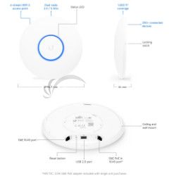 PŘEHLEDUbiquiti UniFi AC Pro je 802.11ac UAP zařízení. Jedná se o 3x3 MIMO 2,4GHz i 5GHz Acess Point s rychlostí přenosu až 1300+450 Mbps a podporou norem 802.11a/b/g/n/ac. UAP je určeno například pro kanceláře, hotely, sklady a díky voděodolnému provedení i venkovní prostory. Anténní systém obsahuje tři dualband 3 dBi antény s dosahem do vzdálenosti až 122 metrů. Plně podporuje také roaming při předávání asociovaných klientů mezi jednotlivými AP. Obsahuje 2x Gigabit LAN s 48V (44 až 57V) napájením přes PoE (pasivní i aktivní 802.3af/802.3at) a jedním portem USB 2.0.