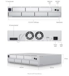 NVR má výkon pre nahrávanie až 60 kamier vo Full HD rozlíšení alebo 20 kamier v 4K rozlíšení a uchovaním záznamu po dobu 60 dní. NVR podporuje až 7 diskových pozícií pre SSD/HDD s maximálnou kapacitou 16TB/disk, podporuje RAID 1/5/10 pre vyššiu spoľahlivosť uchovania dát, má 3" dotykový displej, ktorý s neskoršou verziou bude umožňovať aj náhľad videa, Gigabit LAN port, SFP+ port s podporou rýchlosťou 1G/10Gbps a redundantné napájanie pomocou UniFi SmartPower (USP-RPS).