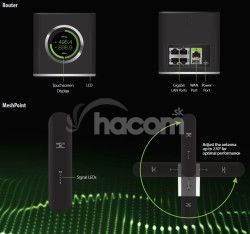 Bezdrátový router se 4 LAN porty (1Gbit) a 1 WAN portem (1Gbit) podporuje bezdrátové standardy 802.11a/b/g/n/ac s modulační rychlostí 450+1300Mbps a vysílacím výkonem 26dB. Vše pak doplňují dva MeshPointy se stejnými bezdrátovými parametry. Díky MeshPointům můžete maximalizovat pokrytí vašeho bytu nebo rodinného domku.