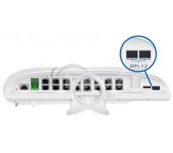 Čo sa konektorov a rozhraní týka, zariadenie má veľmi bohatú výbavu a obsahuje (16) 10/100 / 1000Mbps ethernetových portov s podporou POE, (2) SFP / SFP + portov s rýchlosťou 1 / 10Gbps, (1) sériový RJ45 port a DC svorkovnicu pre priame pripojenie el.energie. Celé zariadenie je poháňané ARM procesorom Cortex-A9 s taktom 400MHz, 256MB RAM a vnútorným úložiskom o veľkosti 32MB.