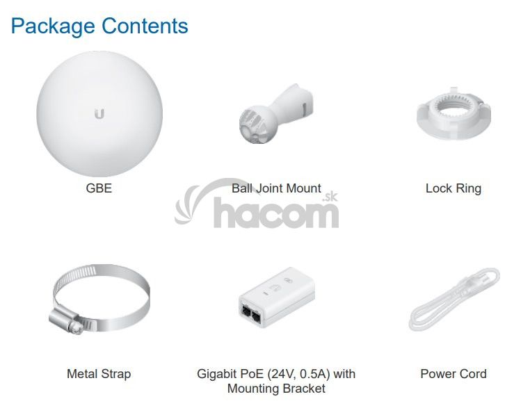 Zariadenie je vybavené jedným ethernetovým portom 10/100 / 1000Mbps a tiež 2.4GHz rádiom, ktoré slúžia pre jeho správu. Napájanie cez PoE je pomocou priloženého pasívneho adaptéru 24V / 0,5A s gigabitovým portom.