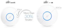 UAP-nanoHD je nejmenší přístupový bod UniFi. Je o 30% menší než verze UAP AC Pro a přibližně stejně veliký jako UAP-AC-Lite.