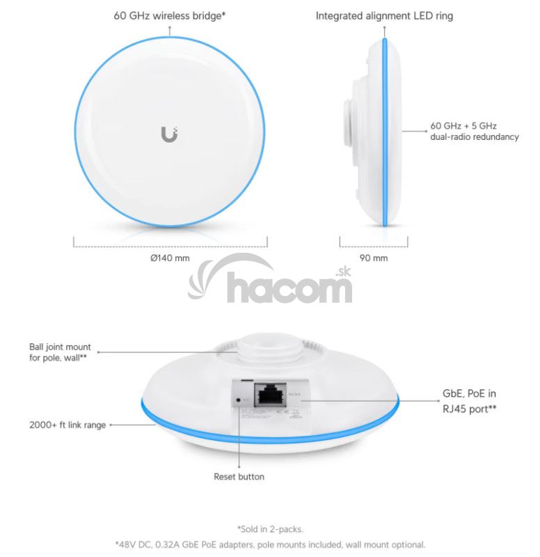 popis produktuUNIFEM Building Bridge je 60GHz point-to-point spojenie s 5GHz zálohou pre rozšírenie siete napríklad o susedné budovu. Priepustnosť pojítka je 1.7Gbps + s maximálnym dosahom 500m a správou alebo monitoringom cez UNIFEM Controller.