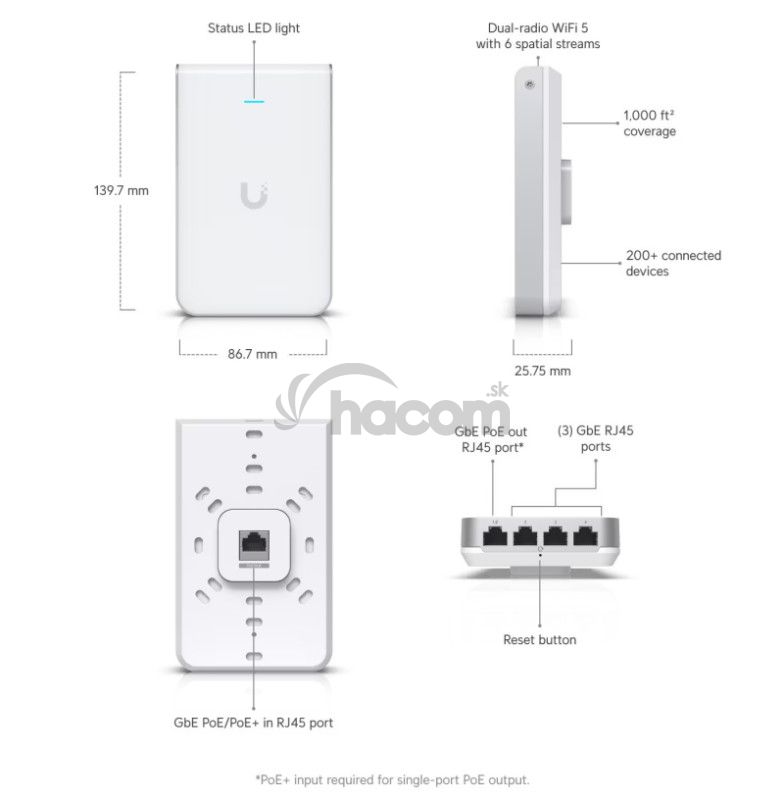 Zařízení je vybaveno také ethernetovým switchem, na spodní straně naleznete 4 Gigabitové ethernety, kdy na prvním portu je možné využít funkci PoE passthough. 1 přívodní Gigabitový port pak naleznete na zadní straně zabudované do zdi.