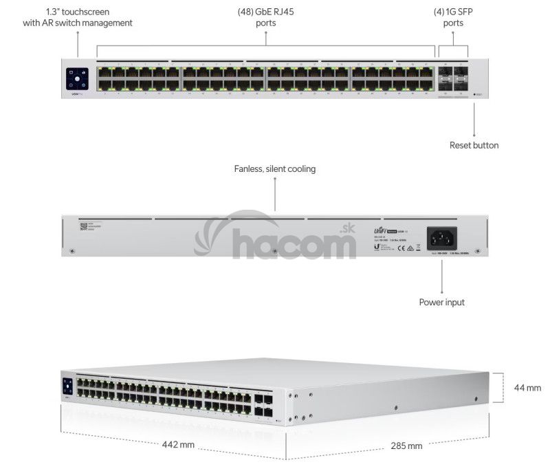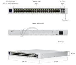 Konektory a rozhraníRychlost LAN: (48) 10/100 / 1000MbpsOptické rozhranie: (4) 1000MbpsOstatní: Dotykový displejNapájeníTyp napájanie: Zo siete (230V) Max. spotreba energie [W]: 40Napájení cez konektor / svorkovnicu: 230V ACFyzické charakteristikyProvedení: RackmountVentilátory: Bez ventilátoruŠasi: KovovéTlačítka: ResetProvozní teplota [° C]: - 15 až 40Šířka [mm]: 442Výška [mm]: 44Hloubka [mm]: 285ObecnéRychlost prepínanie [Gbps]: 52Rychlost odovzdávanie paketov [Mpps]: 77,4SoftwareManagement: UNIFEM controller, CLIFunkce: VLAN, QoS, DHCP snoopingVýchozí IP adresa: Dynamická z DHCPVýchozí meno a heslo: ubnt / ubnt