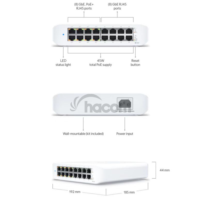 popis produktuUsw-Lite-16-PoE je Gigabitový PoE L2 Switch od Ubiquiti Networks v desktop prevedení s maximálnym PoE BUDG 45W. Managovateľný switch s 16 Gigabit metalickými portami a celkovú priepustnosť 16 Gbps. Iba 8 portov z 16tich podporuje PoE napájanie 802.3af / at s maximálnym výkonom 30W / port. Switch je vďaka nízkemu PoE budgetu vhodný skôr ako dátový s napájaním pár zariadení na okraji siete.