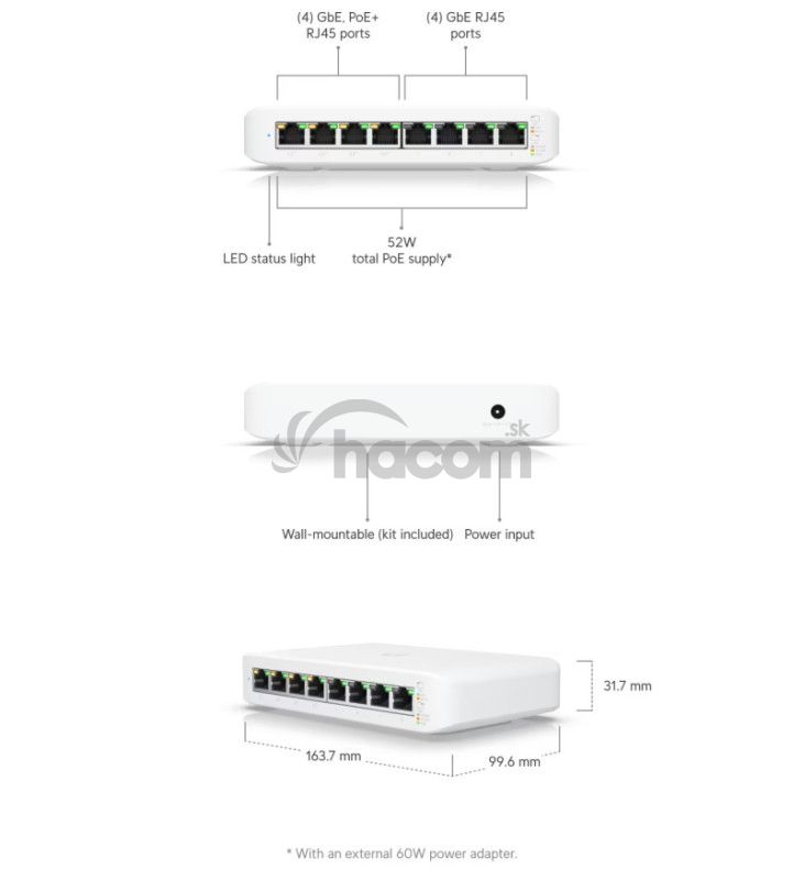 popis produktuUsw-Lite-8-PoE je Gigabitový PoE L2 Switch od Ubiquiti Networks v desktop prevedení s maximálnym PoE BUDG 52W. Managovateľný switch s 8 Gigabit metalickými portami a celkovú priepustnosť 16 Gbps. Iba 4 porty z 8 podporuje PoE napájanie 802.3af / at s maximálnym výkonom 30W / port. Switch je vďaka nízkemu PoE budgetu vhodný skôr ako dátový s napájaním pár zariadení na okraji siete.