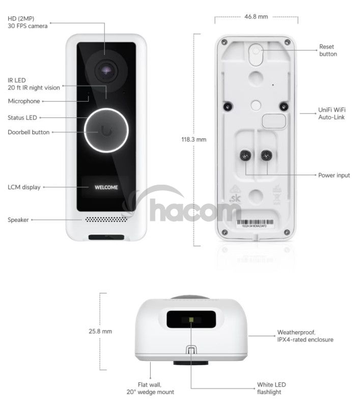 popis produktuUNIFEM Protect G4 Doorbell is a Wi-Fi video Doorbell with a built-in display and real-time two-way audio communication. The camera features a high-quality 5MP sensor with enhanced night vision. Image streams can be viewed in up to 1600x1200 (2 MP) HD at 30 FPS. UNIFEM Protect G4 Doorbell includes a PIR sensor for instant motion detection alerts. Integration with UNIFEM Protect provides an easy-to-use interface.