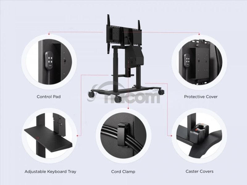 Viewsonic - VB-STND-008Motorizovaný stojan ViewSonic na kolieskach bezpečne pojme interaktívne ploché panely ViewSonic 55“, 65“, 75“ a 86“ ViewBoard alebo akýkoľvek displej s hmotnosťou až 75 kg. Vďaka integrovanému ovládaniu na obrazovke je možné výšku stojana ľahko nastaviť pomocou panela nástrojov aplikácie ViewBoard bez prerušenia.