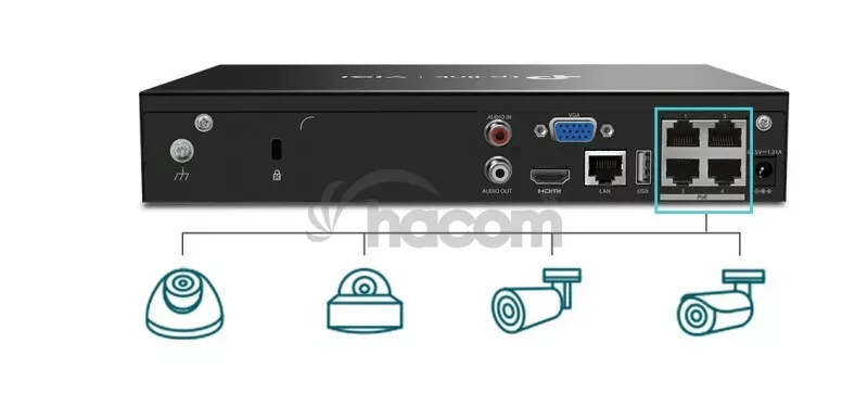 VIGI NVR1004H-4P-2TB 4 Channel PoE Network Video Recorder- Built in 2TB HDDSPEC: H.265+/H.265/H.264+/H.264, Up to 8MP resolution, Decoding capability/4-ch @4MP, 80 Mbps Incoming Bandwidth (up to 4 kanály), 4× 10/100 Mbps PoE+ Ports, Max Output 53W, 802.3 af/at, 1× SATA Interface (up to 10 TB, Built in 2TB HDD), 2× USB 2.0, 53.5VDC/1.31A, 1× VGA port & 1× HDMI port (Up to 4K) (Synchronous Outputs) , Web, VIGI Security ManagerParametre