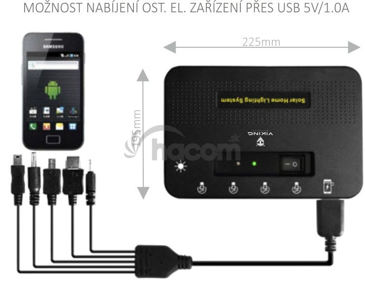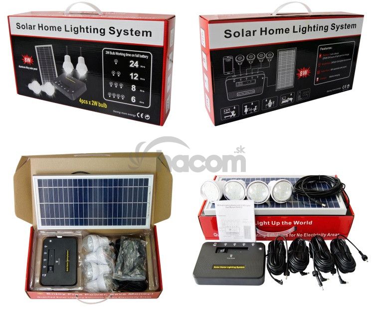 Príslušenstvo: Redukcia pre mobilné telefóny 5v1, Solárny panel 8W, 4x2W ľad svetlo, návod v CJ