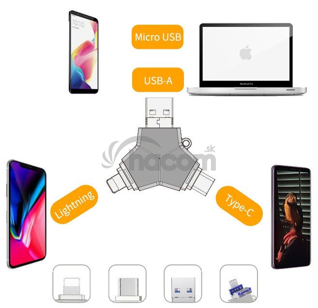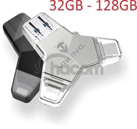 VIKING USB FLASH DISK 3.0 4v1 s koncovkou Apple Lightning / Micro USB / USB 3.0 / USB-CNový, moderný a extrémne ľahký USB FLASH DISK 4v1 s koncovkou APPLE LIGHTNING / MICRO USB / USB-C / USB 3.0 s internou pamäťou 32GB.