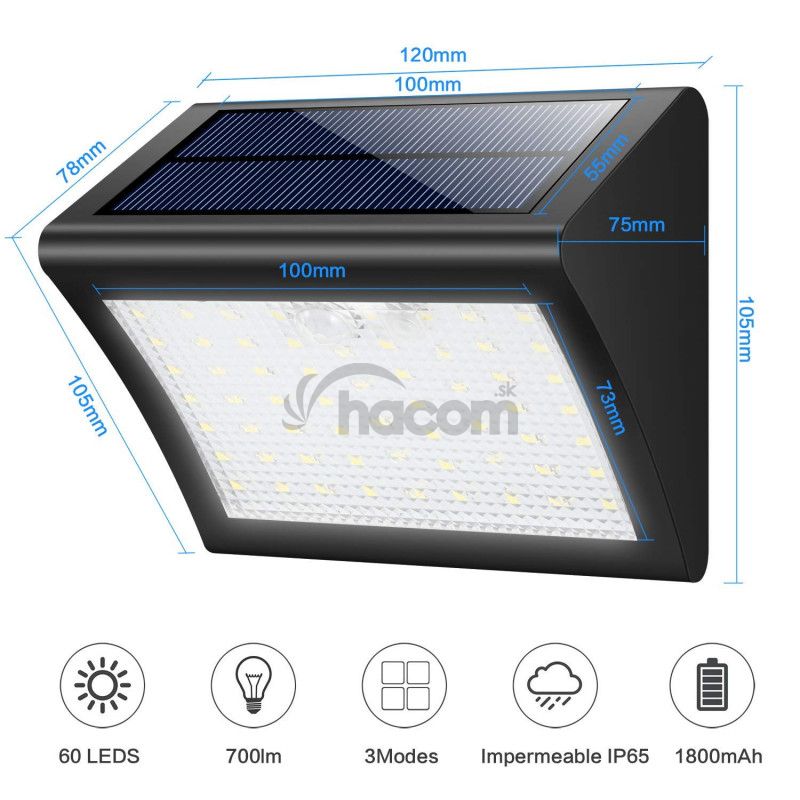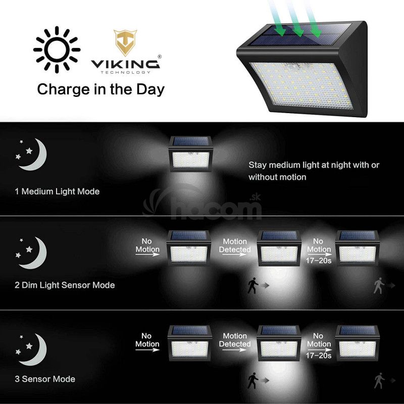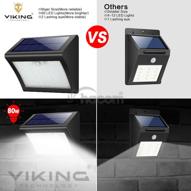 Vonkajšie solárne LED svetlo s pohybovým senzorom VIKING V60Solárne LED svetlo s pohybovým senzorom a so 60 ks vysoko svietiacimi LED diódami, je ideálna na osvetlenie vonkajších priestorov, ako je napr. Záhrada, schodisko, garáž, vstup do domu, atď., Bez možnosti pripojenia k el. sieti.