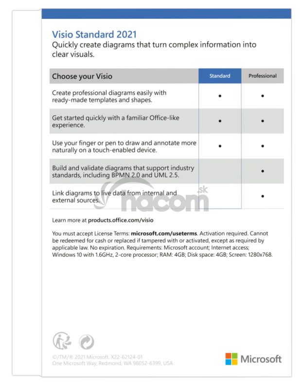 Visio Standard 2021 Win Eng• Ľahko dokážete pomocou vopred pripravených šablón a obrazcov vytvárať profesionálne diagramy.