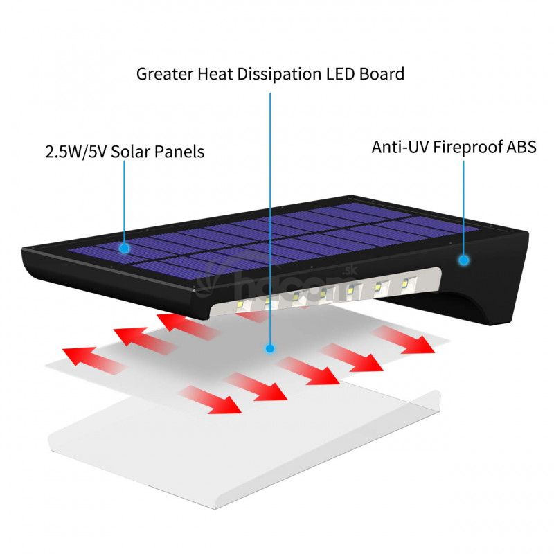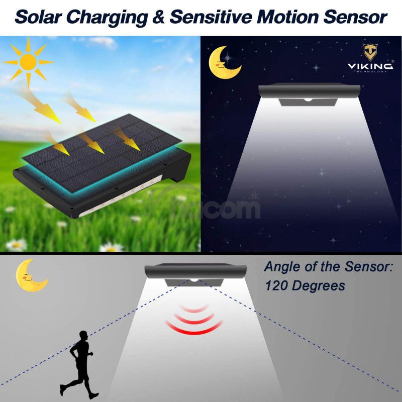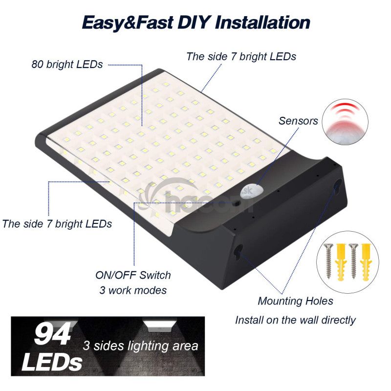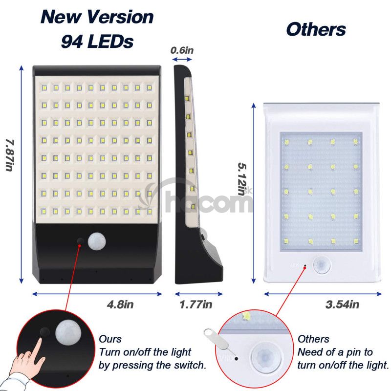 Solárne LED svetlo s pohybovým senzorom as 94ks vysoko svietiacimi LED diódami, je ideálna na osvetlenie vonkajších priestorov, ako je napr. Záhrada, schodisko, garáž, vstup do domu, atď., Bez možnosti pripojenia k el. sieti.Vďaka solárnemu napájaniu je LED svetlo úplne sebestačné a nezávislé na napájanie z el. siete.