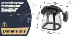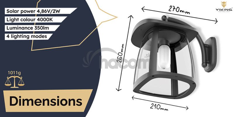 Svietivosť 350 lm • solárne napájanie • farba svetla 4000K (denná biela) • 4 režimy osvetlenia • doba osvetlenia za nevhodných podmienok viac ako 10 dní • odolnosť IP54 • kapacita batérie 3,7V/7,4Wh • výkon solárneho panelu 4,86V/2WVonkajšie solárne LED svetlo Viking SR10W