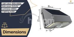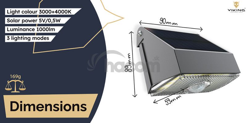 Svietivosť 1000 lm • solárne napájanie • farba svetla 3000K + 4000K (teplá a denná biela) • 3 režimy osvetlenia (vrátane PIR senzora) • doba osvetlenia za nevhodných podmienok až 3 dni • odolnosť IP54 • kapacita batérie 3,7V/7,4Wh • výkon solárneho panelu 5Vonkajšie solárne LED svetlo s pohybovým senzorom Viking SR11