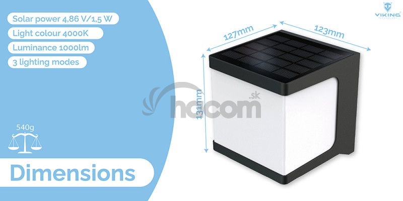 Svietivosť 1000 lm • solárne napájanie • farba svetla 4000K (denná biela) • 3 režimy osvetlenia • doba osvetlenia za nevhodných podmienok viac ako 10 dní • odolnosť IP54 • kapacita batérie 3,7V/7,4 Wh • výkon solárneho panelu 4,86 V /1,5 WVonkajšie solárne LED svetlo s pohybovým senzorom Viking SR18