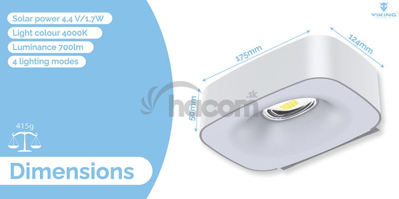 Svietivosť 700 lm • solárne napájanie • farba svetla 4000K (denná biela) • 4 režimy osvetlenia • doba osvetlenia za nevhodných podmienok viac ako 7 dní • odolnosť IP65 • kapacita batérie 3,7V/7,4Wh • výkon solárneho panelu 4,4V/1 ,7WVonkajšie solárne LED svetlo Viking SR38