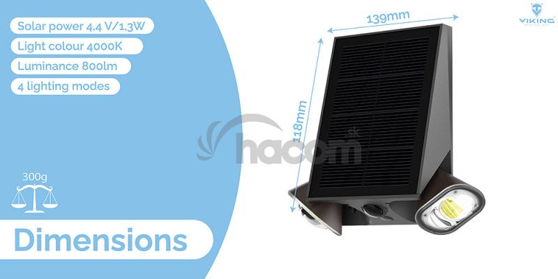 Svietivosť 800 lm • solárne napájanie • farba svetla 4000K (denná biela) • 4 režimy osvetlenia • doba osvetlenia za nevhodných podmienok viac ako 7 dní • odolnosť IP44 • kapacita batérie 3,7V/7,4 Wh • výkon solárneho panelu 4,4 V /1,3 WVonkajšie solárne LED svetlo s pohybovým senzorom Viking SR39