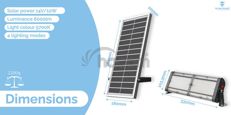 Svietivosť 6000 lm • solárne napájanie • farba svetla 5700K (studená biela) • 4 režimy osvetlenia • doba osvetlenia za nevhodných podmienok viac ako 3 dni • odolnosť IP65 • kapacita batérie 3,7V/57,72 Wh • výkon solárneho panelu 14V/10WVonkajšie solárne LED svetlo Viking SR40