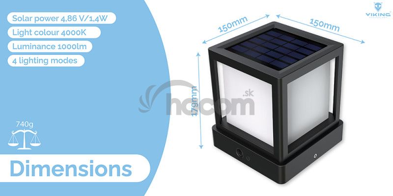 Svietivosť 1000 lm • solárne napájanie • farba svetla 4000K (denná biela) • 4 režimy osvetlenia • doba osvetlenia za nevhodných podmienok viac ako 10 dní • odolnosť IP54 • kapacita batérie 3,7V/7,4 Wh • výkon solárneho panelu 4,86 V /1,4 WVonkajšie solárne LED svetlo s pohybovým senzorom Viking SR54
