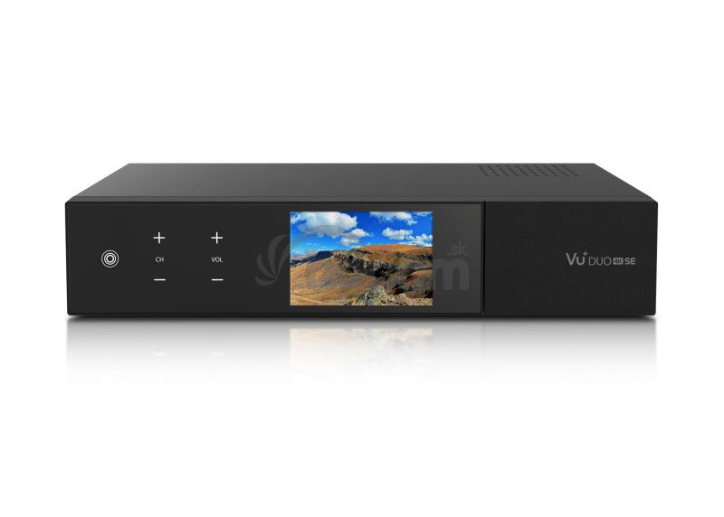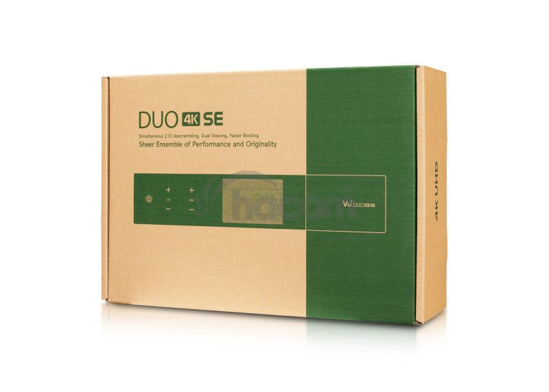 Vu+ DUO 4K SE vo verzii s duálnym satelitným DVB-S2X tunerom (2x satelitný DVB-S2X + 6x virtuálny tuner). Vu+ DUO 4K SE je 4K prijímač s UHD rozlišením 2180p as najnovšími obrazovými normami pre 4K - HDR10 a HLG. Predný panel je vybavený farebným LCD displejom vo veľkosti 3,5" palca s funkciou Mini TV a dotykovými tlačidlami ovládania hlasitosti a prepínania programov. Ďalej obsahuje zabudovanú čítačku kariet a dva CI sloty pre vloženie prístupového dekódovacieho modulu. s frekvenciou 1,5 GHz doplnený o operačnú pamäť 3GB LPDDR4 a flash pamäť 4GB eMMC. Možnosť osadenia až dvoch vymeniteľných FBC tunerov (slot A – osadený satelitným FBC tunerom, slot B – volný slot pre ďalší FBC tuner). Pre pripojenie k internetovej sieti má prijímač zabudovaný gigabitový ethernet, taktiež je možné ho pripojiť k internetu pomocou zabudovanej WiFi. Prijímač disponuje aj zabudovaným Bluetooth adaptérom, ktorého využitie je na Bluetooth diaľkové ovládanie alebo pripojenie Bluetooth Audio zariadenia. Okrem HDMI 2.0 výstupu má prijímač aj HDMI IN konektor pre pripojenie externého zariadenia s HDMI pripojením (XBOX ONE, PS4, DVD a pod.). K pripojeniu USB komponentov má Vu+ DUO 4K SE zabudované dva vysokorýchlostné USB porty 3.0 a jeden 2.0 USB port. Podpora pre obraz v obraze - QUAD PIP.Špecifikácia: