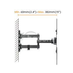 Výsuvný nástenný držiak LPA68-443 je určený na inštaláciu TV s plochou obrazovkou s uhlopriečkami od 23“ do 55“. Má robustnú výsuvnú konštrukciu, vďaka ktorej unesie TV s hmotnosťou až 30 kg, zároveň je možné nastaviť vzdialenosť TV od steny v rozsahu 60 mm až 382 mm. Samozrejmosťou je potom aj veľký rozsah polohovania. Držiak umožňuje ľahké naklápanie TV v rozsahu +3 ° -10 ° a natočenie do strán v rozsahu +90 ° -90 °, čo zaručuje pohodlné sledovanie z ľubovoľného miesta v miestnosti. Integrovaná svorka na káble udržuje káble usporiadané a chránené.Hlavné vlastnosti: