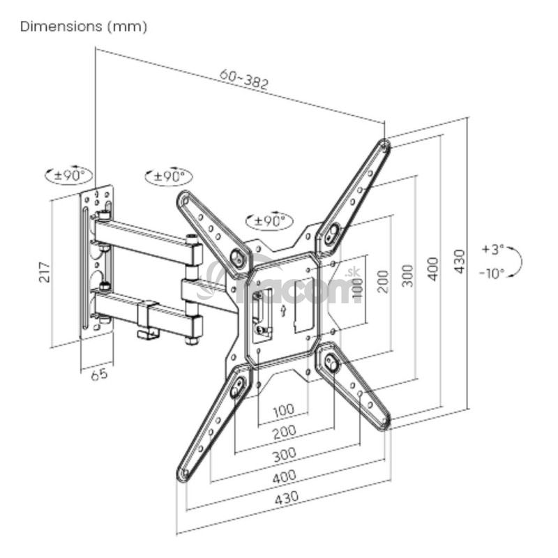 • Voľne sklopiteľná konštrukcia pre jednoduchú zmenu náklonu TV v uhle +3 ° ~ -10 °.