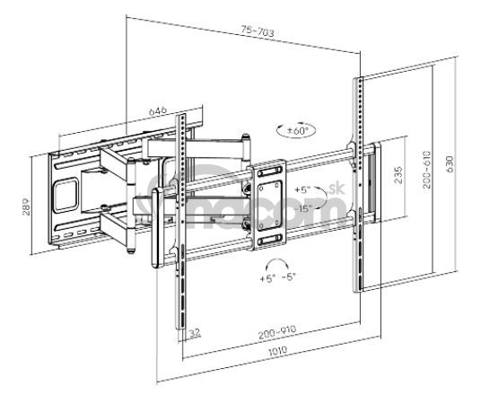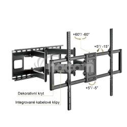 Výsuvný nástenný držiak LPA77-696 je určený na inštaláciu TV s plochou obrazovkou s uhlopriečkami od 60“ do 120“. Jeho najväčšia prednostná je robustná výsuvná heavy-duty konštrukcia, vďaka ktorej unesie TV s hmotnosťou až 120 kg a zároveň umožňuje nastaviť vzdialenosť TV od steny v rozsahu 75 mm až 703 mm, samozrejmosťou je potom aj veľký rozsah polohovania. Držiak umožňuje ľahké naklápanie TV v rozsahu +5°-15°, natočenie do strán v rozsahu +60°~-60° a rotáciu v rozsahu +5°-5°, čo maximalizuje flexibilitu sledovania z ľubovoľného miesta v miestnosti. Integrovaná svorka na káble udržuje káble usporiadané a chránené.HLAVNÉ VLASTNOSTI: