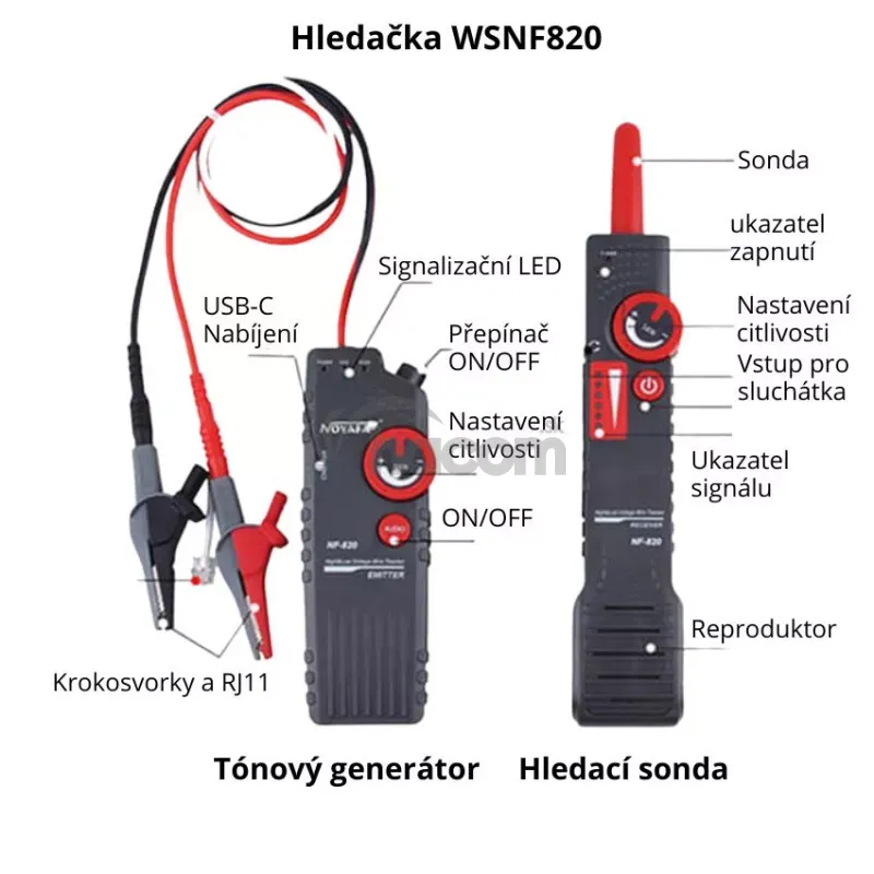 Hľadačka káblov WSNF820, dĺžka 1000m, vzdialenosť 0-2 m, 0-400V, nastavenie citlivosti, AC filter, trasovanie 1 a viac žíl. káblov.Detektor kábla v stene, v podlahe, v strope, traser káblov a rozvodov pod napätím 0-400V a vzdialenosti 0 - 2m.