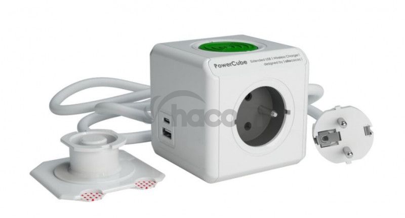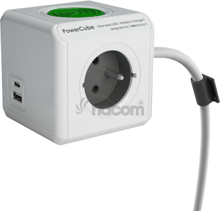 PowerCube Extended USB WirelessCharger ponúka: bezdrôtovú nabíjací podložku (1A, 5V), 3 zásuvky (250V ~, 16A, 3680W), 2 USB porty A + C (2.1A, 2x 5V), 1.5m dlhý predlžovací kábel, detskú poistku a uzemnenie . Zásuvky sa vzájomne neblokujú a neprekážajú. Jednoduchá možnosť kombinácie s ostatnými PowerCube verziami.